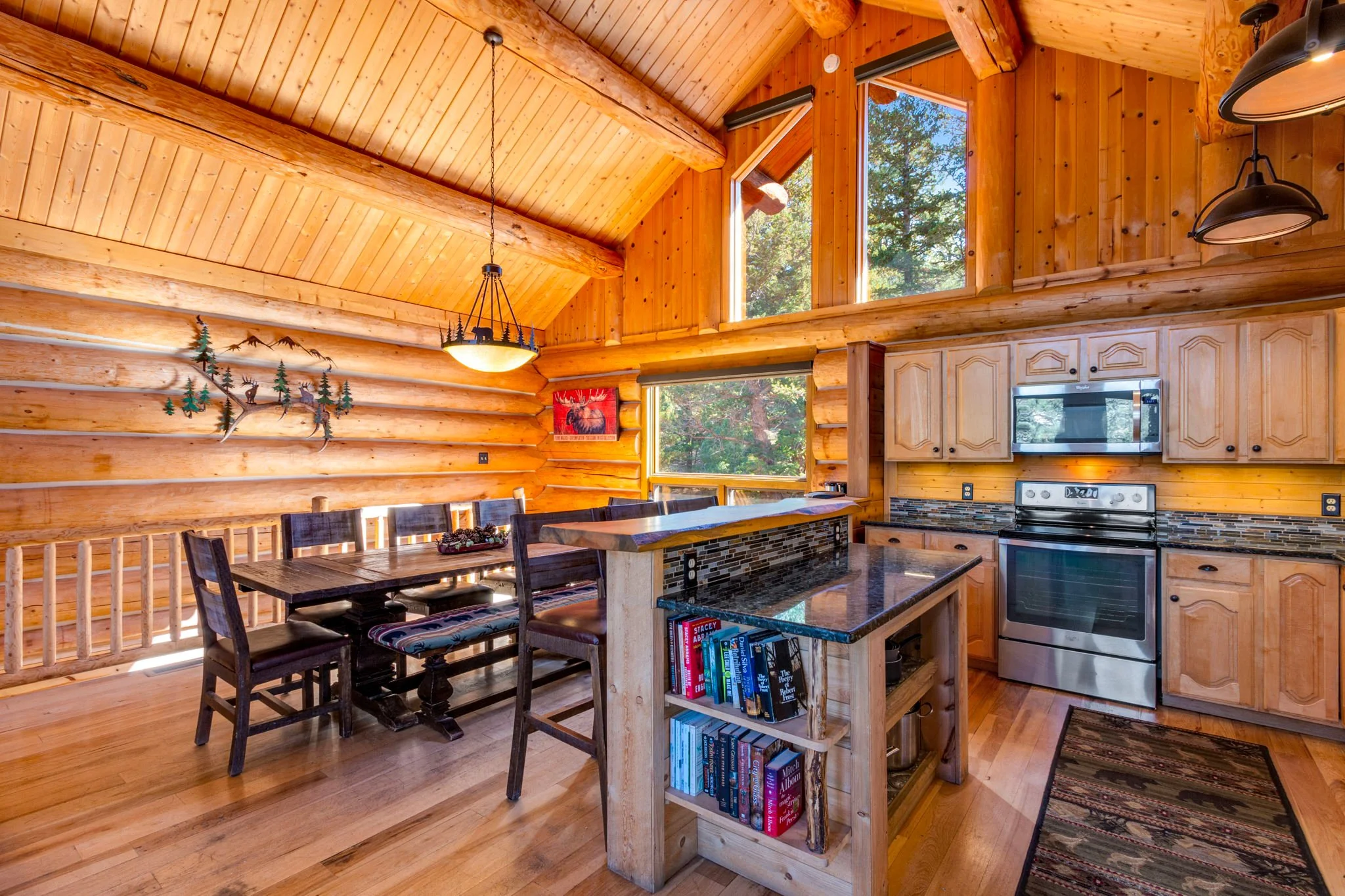 Custom log mountain home featured in HG Magazine winter tour. Hard to find 4 bedroom 3 1/2 bathroom including 3 full suites (sleeps 10); over 500 sqft of wrap-around decking, outdoor dining area in the woods; fireplace, private hot tub spa under the stars, and 2 car attached garage*. 1+ acre wooded setting with spectacular mountain views; authentic log home with modern amenities, open floor plan; great gathering and cooking space. Enjoy hiking in the RMNP, great shopping, and restaurants, Mary's Lake, Estes Lake, golfing, walk to the playground; bike into town or cook a great meal, enjoy all that our private home has to offer and simply do nothing at all!
